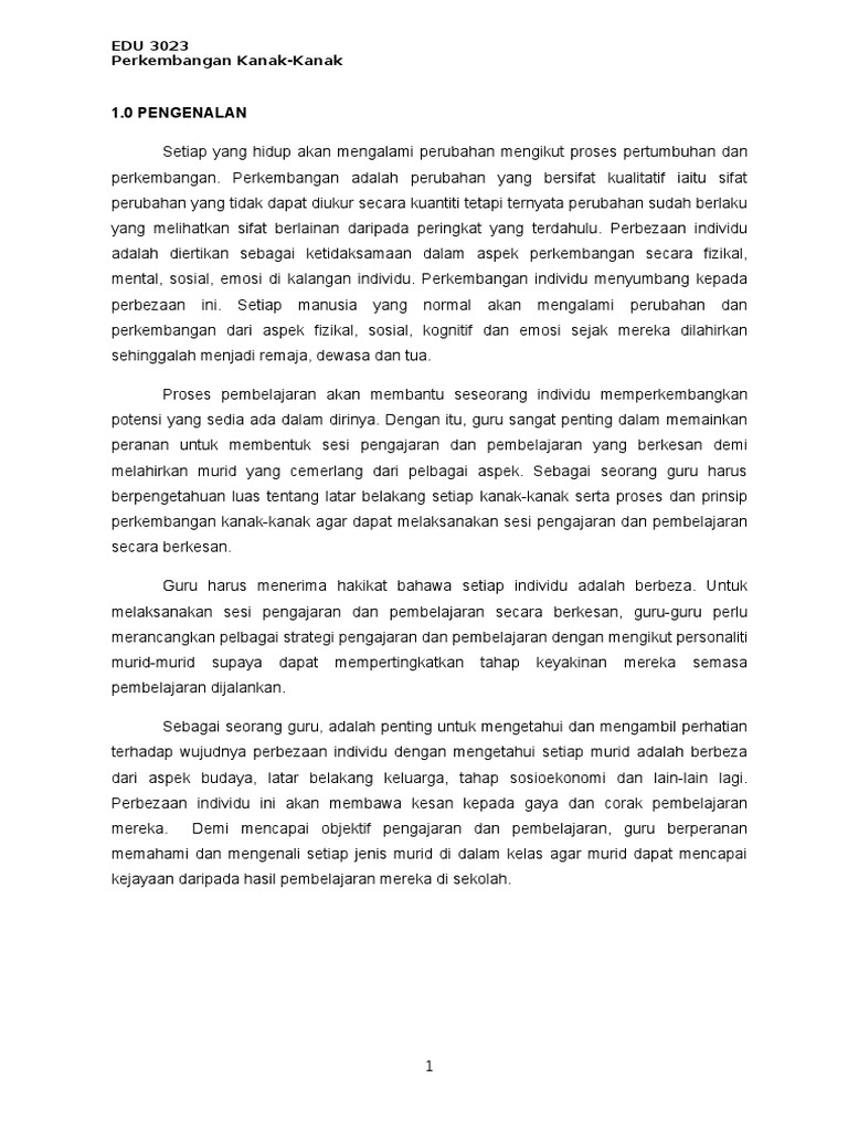Kanak-kanak terbahagi kepada dua iaitu kanak-kanak awal serta kanak-kanak perte Read more. Tujuan tugasan ini adalah untuk memberi pendedahan kepada pelajar tentang pengetahuan asas pendidikan awal kanak-kanak dan kajian perpustakaan. Proses ini dikenali sebagai pembangunan dan ia merangkumi beberapa bidang termasuk pembangunan kognitif pembangunan fizikal.